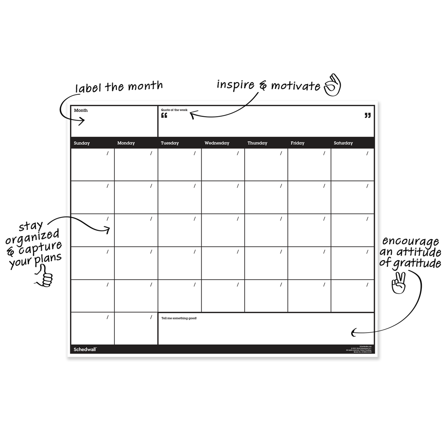 The perfect companion to the original or one of our weekly planners, Schedwall Monthly is great for super-organized folks who map out their week and need to keep going! Schedwall Monthly is the peel-and-stick whiteboard calendar that inspires you to stay motivated, maintain a positive attitude, and celebrate things that make you smile. Schedwall Monthly gives you a snapshot of the month ahead, while helping you track and accomplish your daily To-Do’s. With Schedwall Monthly, everyone in your house will be gratefully organized. Now in a 2-Pack!