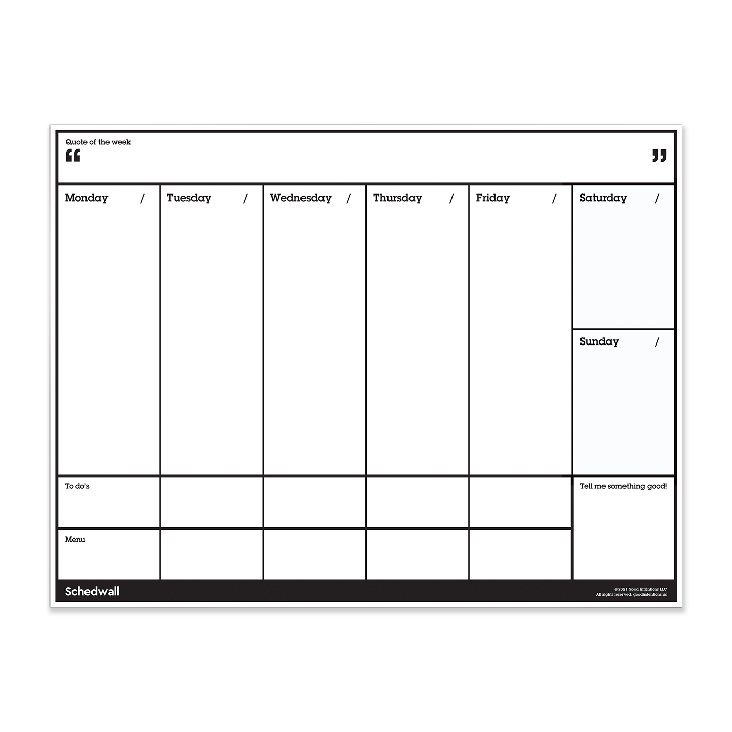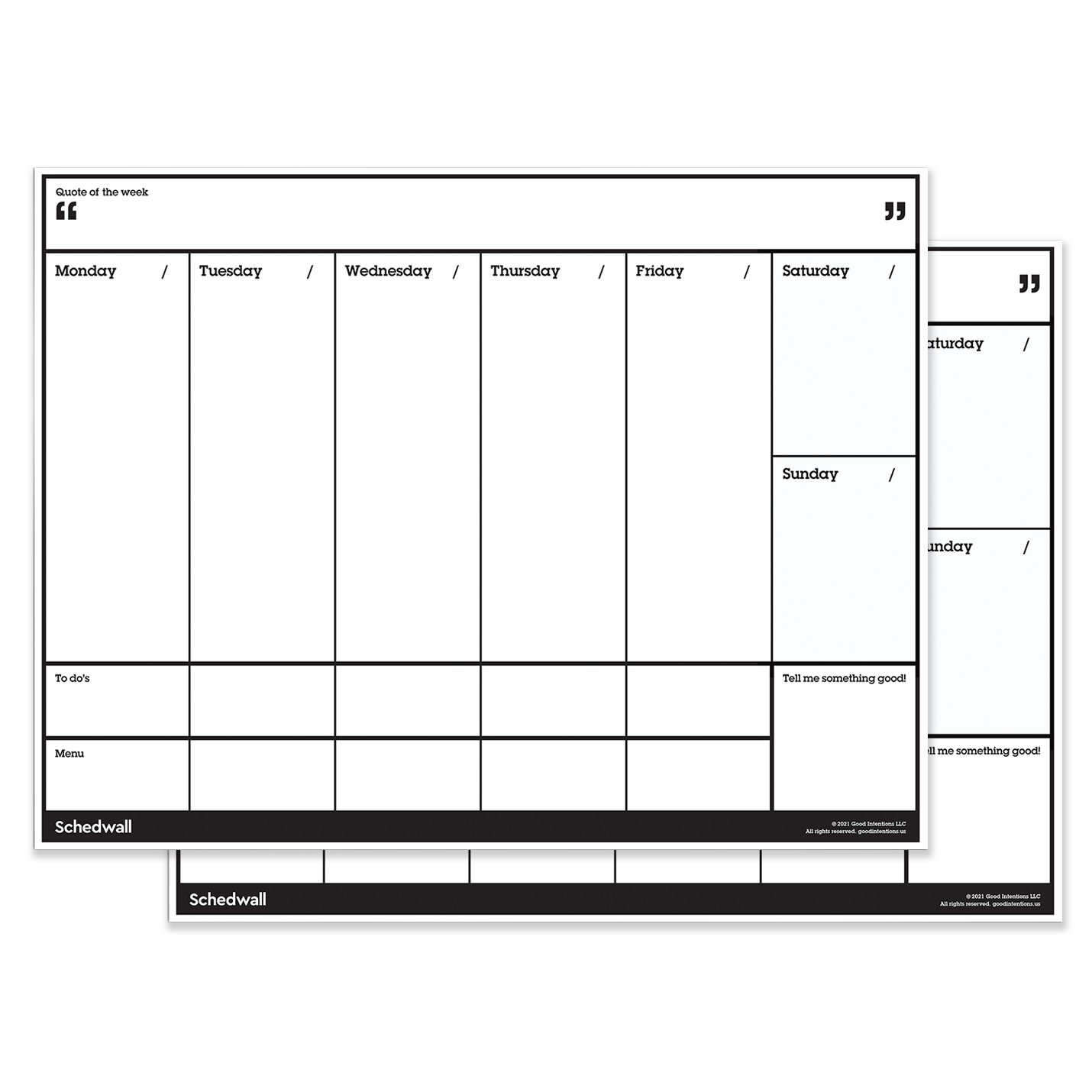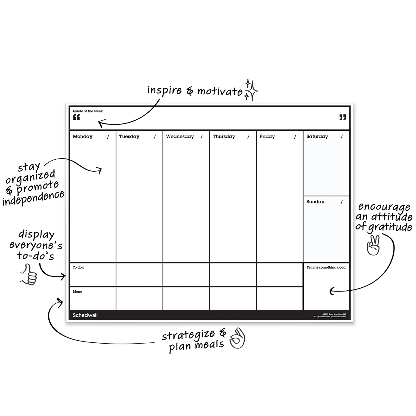 This is the Schedwall that started it all. The peel-and-stick weekly whiteboard planner with a focus on celebrating gratitude and promoting independence. With Schedwall, everyone in your family will know where to find answers to their most common questions (never again hear the dreaded question, “what’s for dinner!?”). Schedwall helps you stay motivated, maintain a positive attitude, and tackle everything your busy week has in store for you. Wipe off, repeat. Now in a 2-Pack!